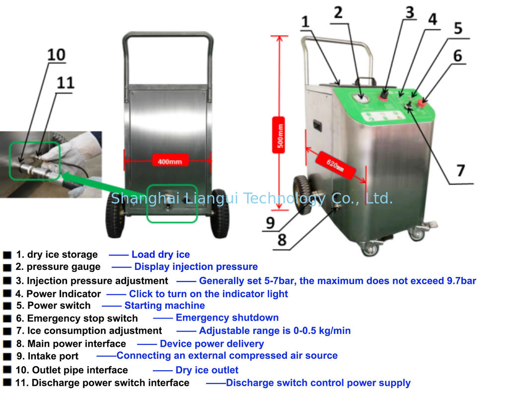 이 기계는 자동차의 드라이 아이스 클리너로 사용될 수 있는 드라이 아이스 청소용 전기 장비입니다.